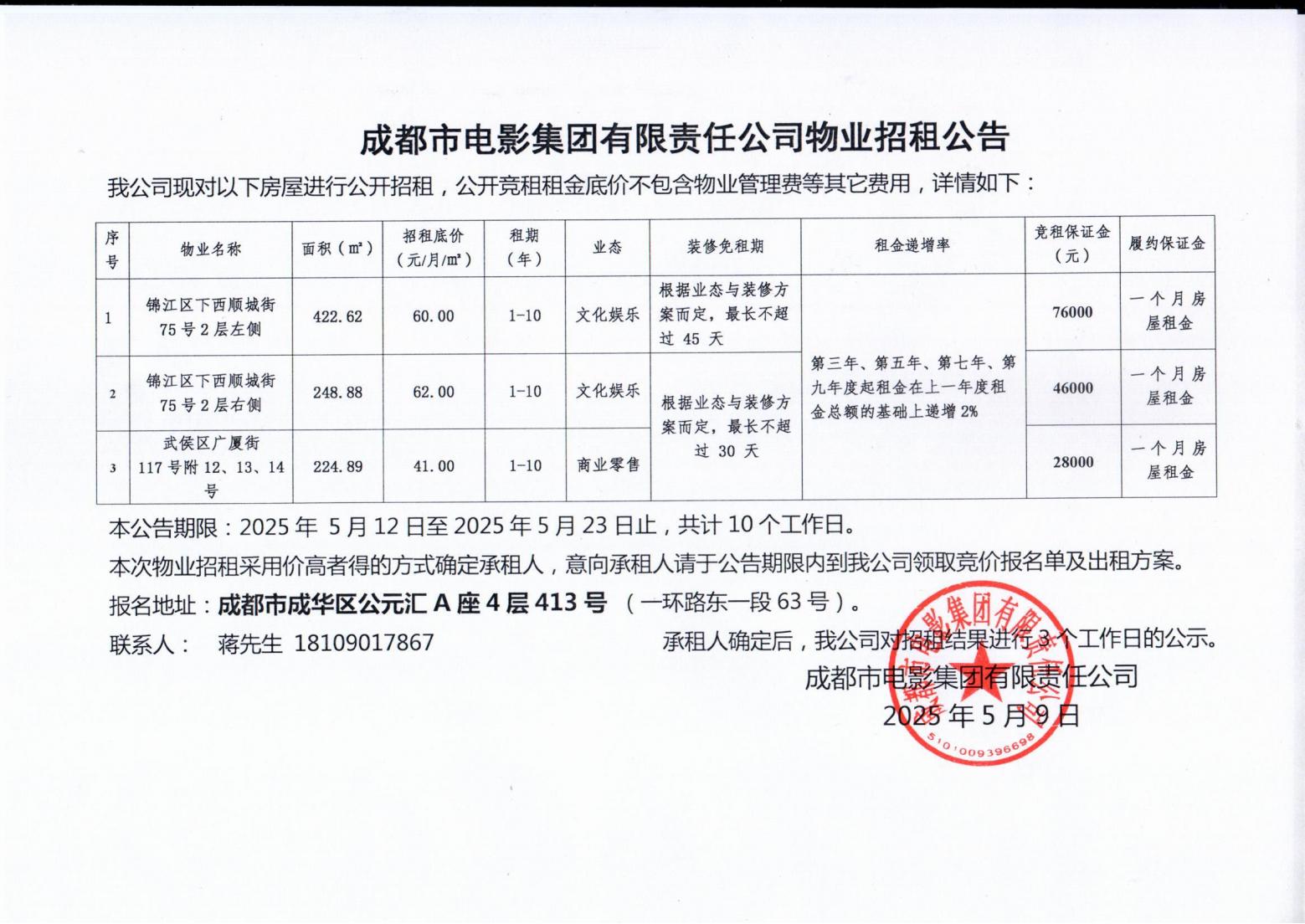 成都市電影集團(tuán)有限責(zé)任公司物業(yè)招租公告