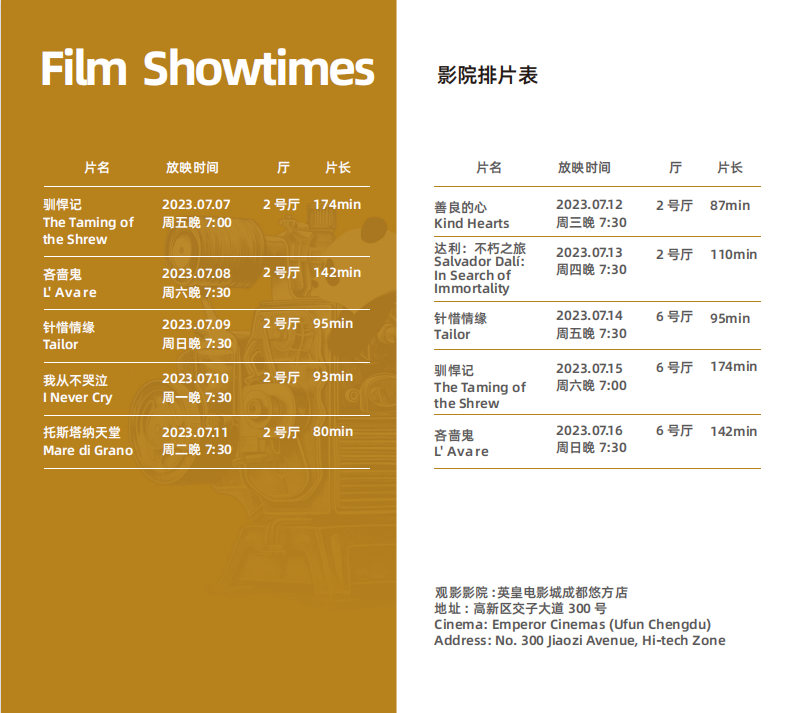 本次電影周選取的影片極具代表性。紀(jì)錄片《達(dá)利:不朽之旅》講述了西班牙超現(xiàn)實主義藝術(shù)家薩爾瓦多·達(dá)利的傳奇一生與傳世畫作;取材于英國杰出戲劇家莎士比亞最具“冒犯性”劇本的戲劇片《馴悍記》,在全片“笑果”不斷的同時,也用“以古現(xiàn)今”的方式引發(fā)觀眾對當(dāng)下的思考;取材于法國著名劇作家莫里哀代表作的戲劇片《吝嗇鬼》,生動描繪了世界文學(xué)史上“四大吝嗇鬼”之一“阿巴貢”的形象;精彩呈現(xiàn)意大利風(fēng)光的《托斯塔納天堂》將跟隨一群兒童冒險家漫游到意大利托斯塔納……