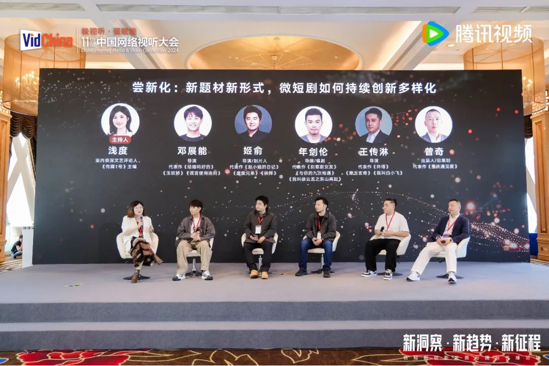 騰訊視頻微短劇一直堅(jiān)持開拓多元廣闊的題材,做品類創(chuàng)新的領(lǐng)跑者。在圓桌討論環(huán)節(jié)二,資深文藝評(píng)論人、《傳媒1號(hào)》主編淺度作為主持人,以“新題材新形式,微短劇如何持續(xù)創(chuàng)新多樣化”為主題與五位導(dǎo)演展開討論,都市微短劇《結(jié)婚嗎好的》導(dǎo)演鄧展能、文物保護(hù)題材微短劇《趙小姐的日記》導(dǎo)演姬俞、無(wú)限流題材微短劇《與你的九次相遇》導(dǎo)演年劍倫、互動(dòng)微短劇《師傅》導(dǎo)演王傳淋和文旅題材微短劇《重慶遇見愛》導(dǎo)演曾奇,分別聚焦于新題材探索、游戲體驗(yàn)再現(xiàn)、文旅賦能等話題分享自身的創(chuàng)新思路,展示了微短劇行業(yè)的新鮮活力與發(fā)展趨勢(shì)。